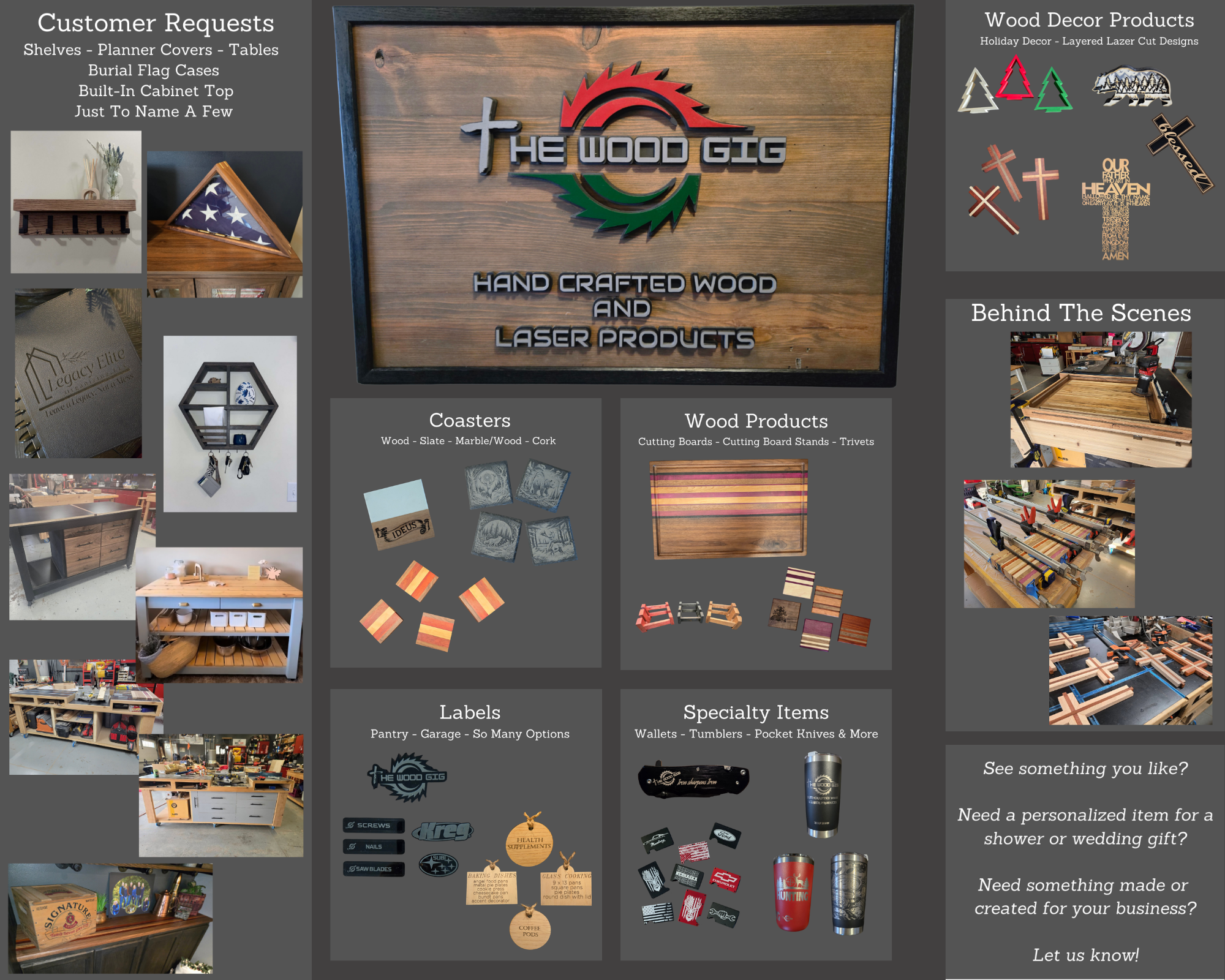 The Wood Gig’s custom laser engraving brings a personal touch to various items including tumblers, pocket knives, glass cups, flasks, cut-out crafts, engraved coasters, and business signs just to name a few. Whether etching a name or logo on a stainless steel tumbler, adding a detailed monogram to a pocket knife, or creating frosted artwork on glassware, laser engraving offers crisp detail, consistent depth, and fast turnaround—perfect for gifts, branding, or custom décor that stands the test of time.