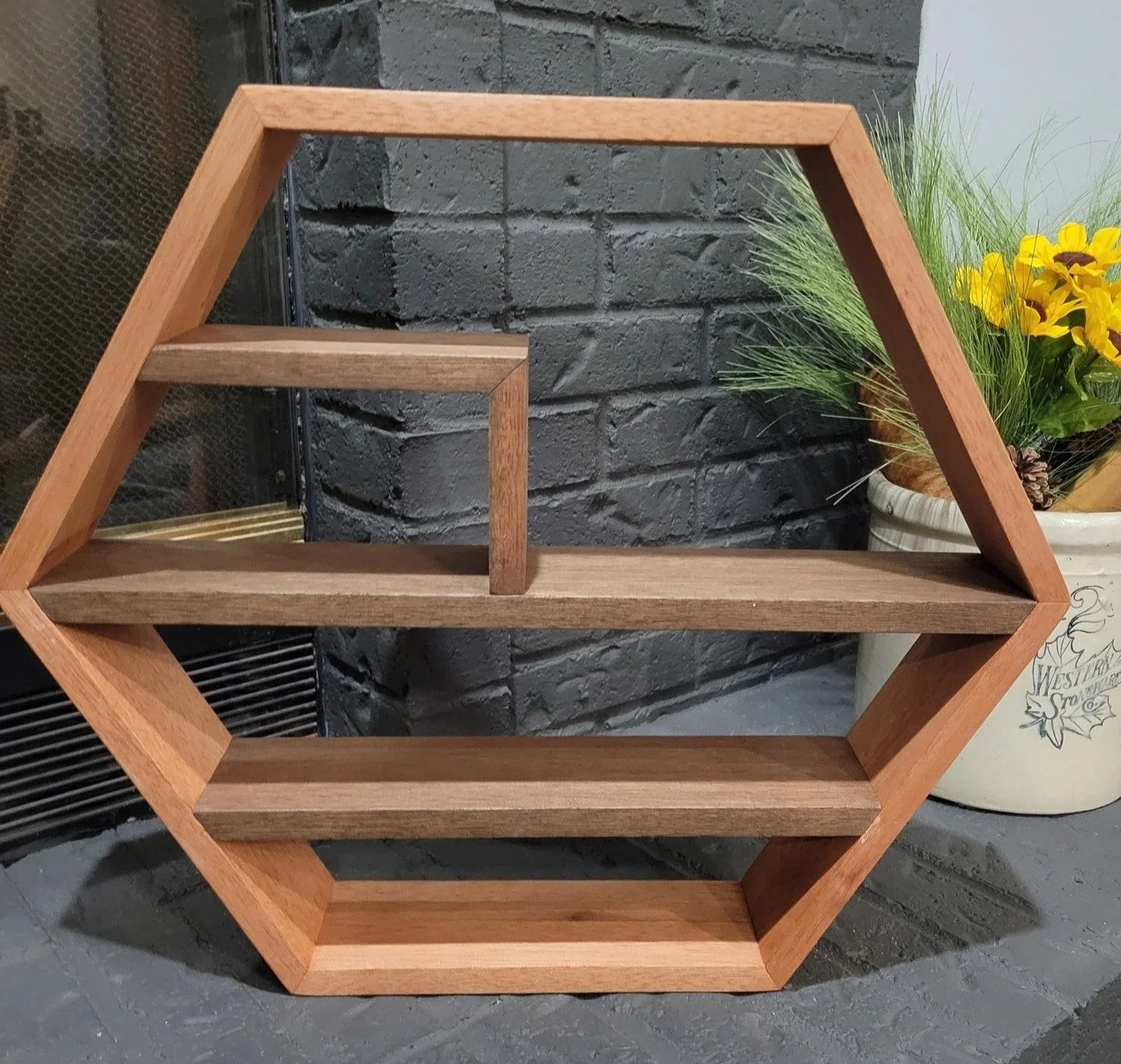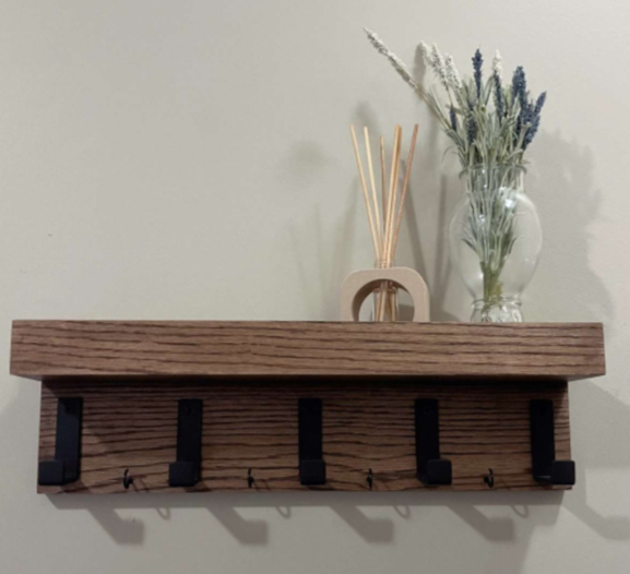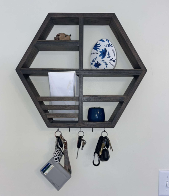 Shelves available in a variety of styles—octagon, flat, and versions with integrated coat hooks. Choose from multiple wood species and stain finishes to match your space. These are just a few of the custom pieces I’ve built.