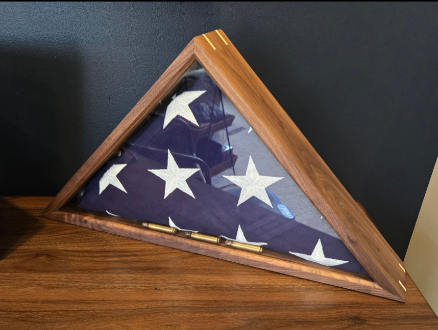Flag display for patriotic presentation. Carefully crafted from your choice of solid oak, walnut, cherry, or maple and finished with a stain that enhances and complements each wood’s natural grain. Built for a proud, durable showcase of your flag — elegant, timeless, and thoughtfully made to honor and preserve its significance.