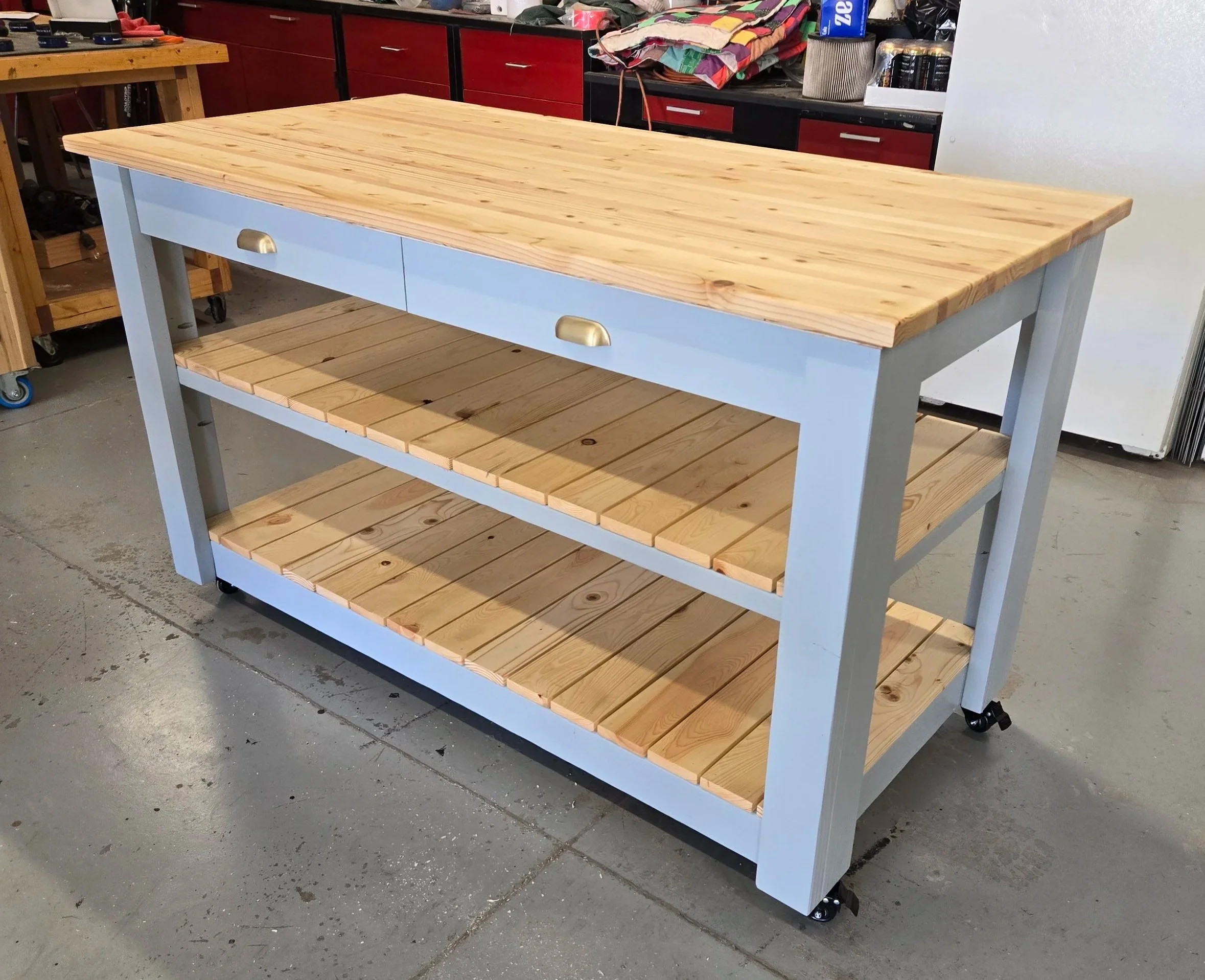 Tables built to your exact size and need, with the features and drawer configurations you need. Finished in any color or stain you choose. Countertops are available in butcher block, cutting board, melamine, or other materials—your pick.